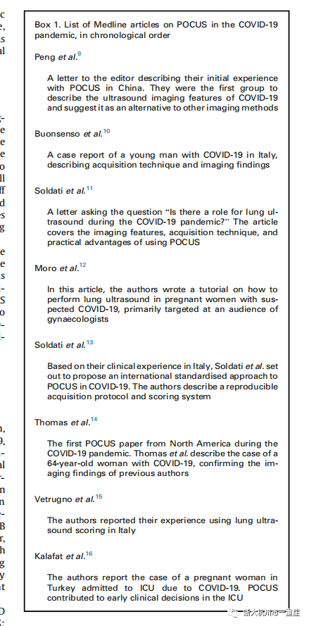 COVID-19流行期间有关POCUS的文献有所增加,尽管主要为病例报导、意见书和指南。本分析源于Box 1中的七篇文章。其包括了撰写本文时,Medline上所有有关COVID-19中POCUS的文章。另外还包括在COVID-19前发表的有关POCUS的文章,这些文章补充了作者对该主题的理解。